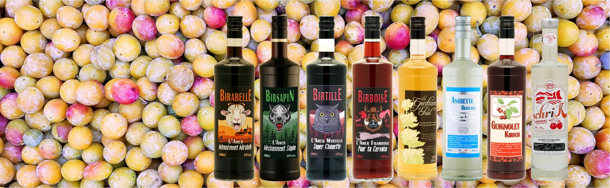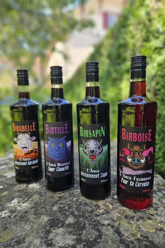 Our 4 bitters have in common gentian and cinchona. Birabelle develops fruity flavors thanks to the Mirabelle brandy, while Birsapin highlights the vegetal notes of fir from the Vosges mountains, and Birtille gives pride of place to the blueberry. Birboise hebt die Himbeere hervor.