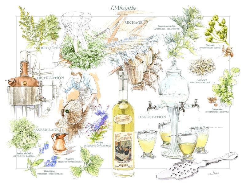 Toutes nos absinthes sont élaborées à partir d’une dizaine de plantes différentes : grande absinthe, petite absinthe, hysope, mélisse, coriandre, … Chaque plantes est mise à macérer, puis distillée séparément. On obtient alors différents distillats que nous assemblons en proportions variables et avec des pourcentages d’alcool différents. Chacune de nos absinthes est unique, mais toujours avec cette saveur anisée caractéristique.