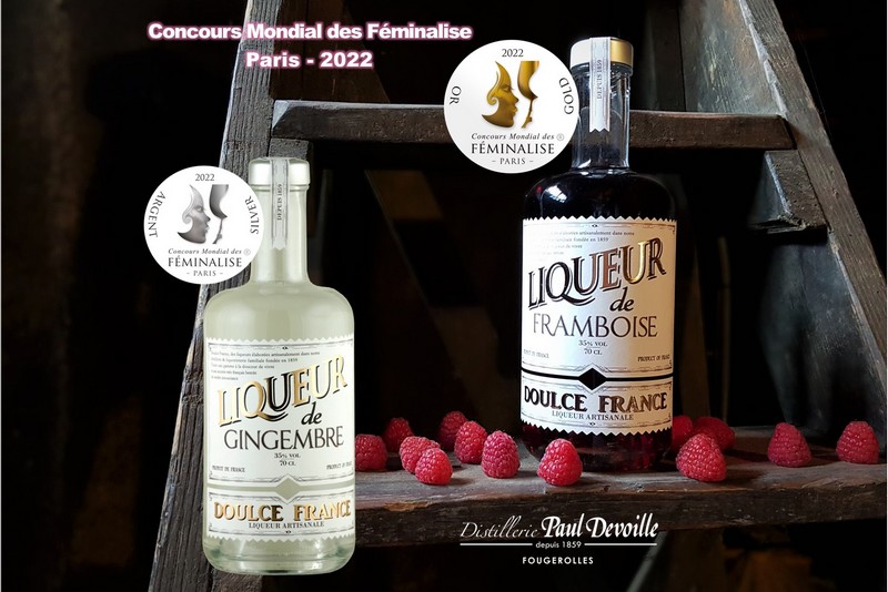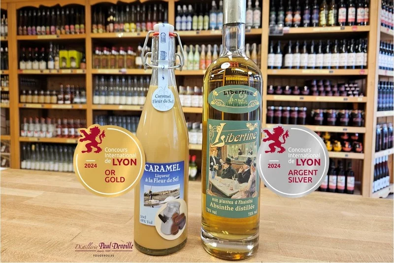 Médaille d’Or = Liqueur Caramel à la Fleur de Sel Médaille d’Argent = Crème de Cerises Noires Médaille d’Argent = La Vieille Poire®