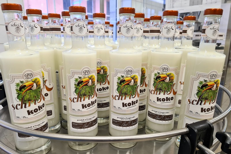 Cousin du SCHRIK Original, le SCHRIK Koko est la dernière création proposée par les distillateurs de Kirsch de Fougerolles AOC. Titrant aussi 17 % vol, SCHRIK Koko est un apéritif à base de Kirsch de Fougerolles AOC réveillé par de la noix de coco. Une façon très originale de bousculer notre terroir avec une touche d’exotisme bienvenue au cœur de l’hiver ! A la Distillerie Paul Devoille, nous aimons le travail d’équipe. Notre liquoriste a réalisé plusieurs propositions de recettes. Ces échantillons ont été dégustés par une grande partie de l’équipe. Dur dur notre travail parfois !! Retenue à l’unanimité, la recette choisie est réalisée sur la base d’une infusion de copeaux de noix de coco dans du Kirsch de Fougerolles AOC. Après une filtration légère, sont additionnés du sucre, de l’eau, une toute petite touche d’arôme naturel de noix de coco et un soupçon de crème de lait pour rappeler le côté lait de coco. SCHRIK Koko, le déguster c’est l’adopter !