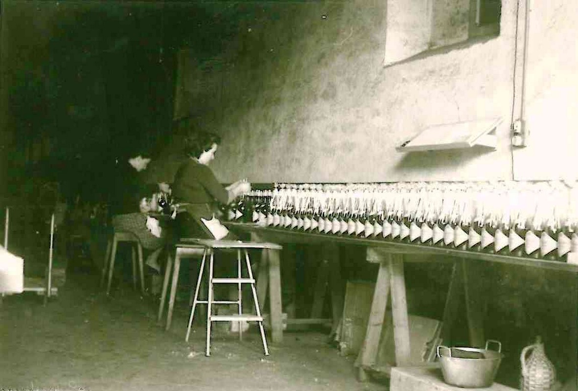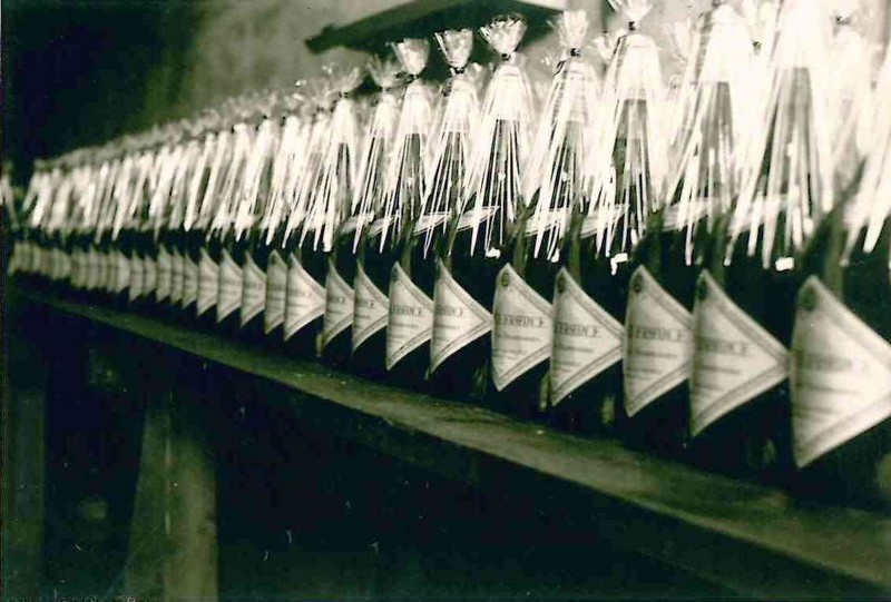 On est au milieu des années 1950. Toutes les bouteilles sont soutirées une à une sur une petite tireuse à becs, puis capsulées sur une petite sertisseuse à la main par les hommes, tandis que les femmes se consacrent à l’étiquetage à la main. Et à cette époque, chaque bouteille est, en plus, emballée individuellement sous cellophane. Cette opération nécessite un tour de main particulier et précis que les ouvrières se transmettent.